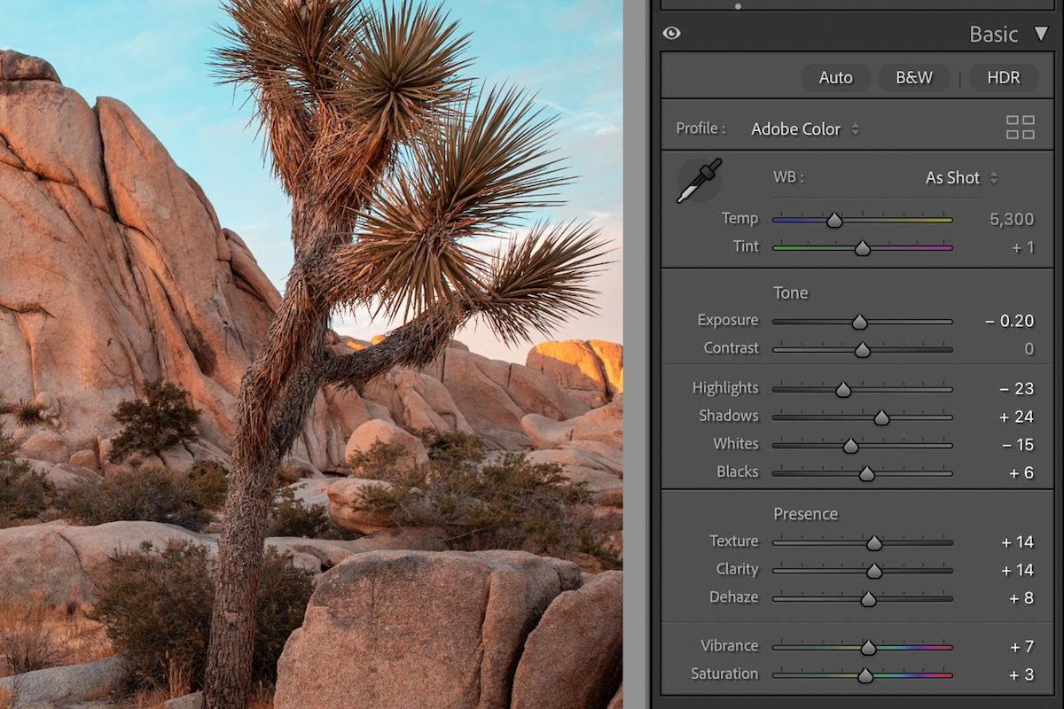 در این مرحله، داشتن یک عکس مرجع که به آن علاقه دارید میتواند مفید باشد. سپس میتوانید این تنظیمات اولیه را طوری تنظیم کنید که به تصویر نهایی مورد نظر شما نزدیک شود.