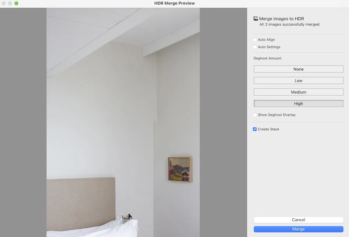 با فعال کردن این گزینه، لایتروم مطمئن میشود تصاویر بهخوبی روی هم منطبق شوند. برای مثال، در HDR Merge با دو عکس دستی (Handheld) پس از انتخاب Auto Align، دیگر متوجه نمیشوید تصویر از دو عکس ترکیب شده است.