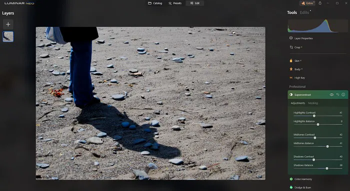 وقتی تصویر خود را در بخش ویرایش Luminar Neo بارگذاری میکنید، کنترلهای کنتراست را زیر عنوان Supercontrast در بخش Professional خواهید یافت.